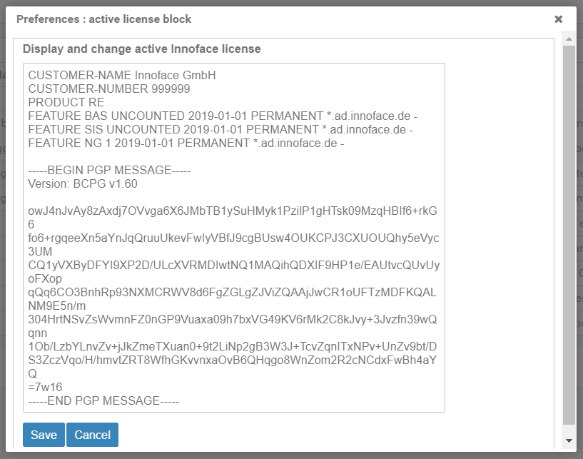 - Active license block: Insert the contents of the license file provided by Innoface here. Once a license has been successfully imported, the block text will show the customer name, customer number and existing features. Licensing details are available under Monitoring.