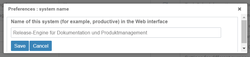 - System name: Special name for this system (e.g. Productive). You can specify an alternative title of the ReleaseEngine cockpit here, which then displays in the header of all pages. This makes it possible to visually distinguish different systems (e.g. Test and Prod).