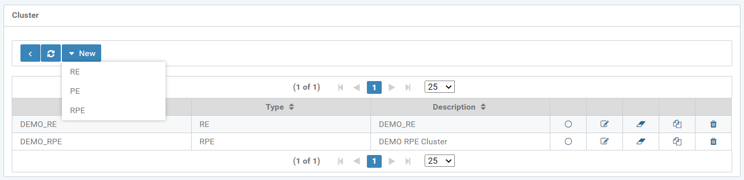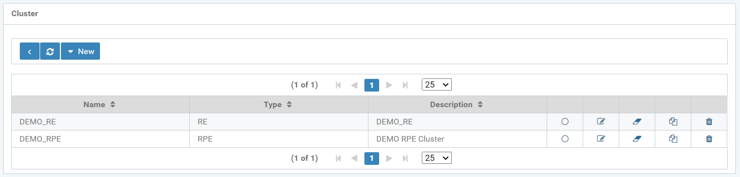 The icons "Back to previous page", "Update overview" and a dropdown menu “New” are at the top of the screen for selecting the various types of clusters.
